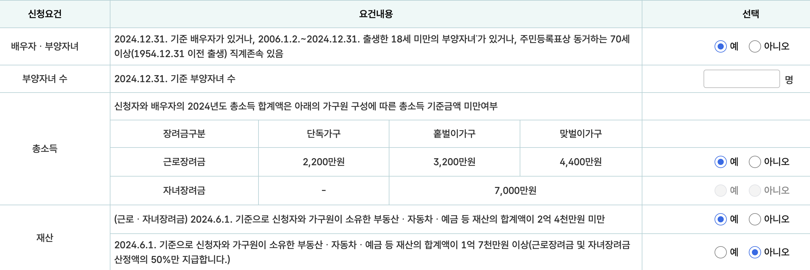 - 부부합산 총소득이 7,000만 원 미만이고 가구 재산 합계가 2억 4천만 원 미만이어야 합니다.
