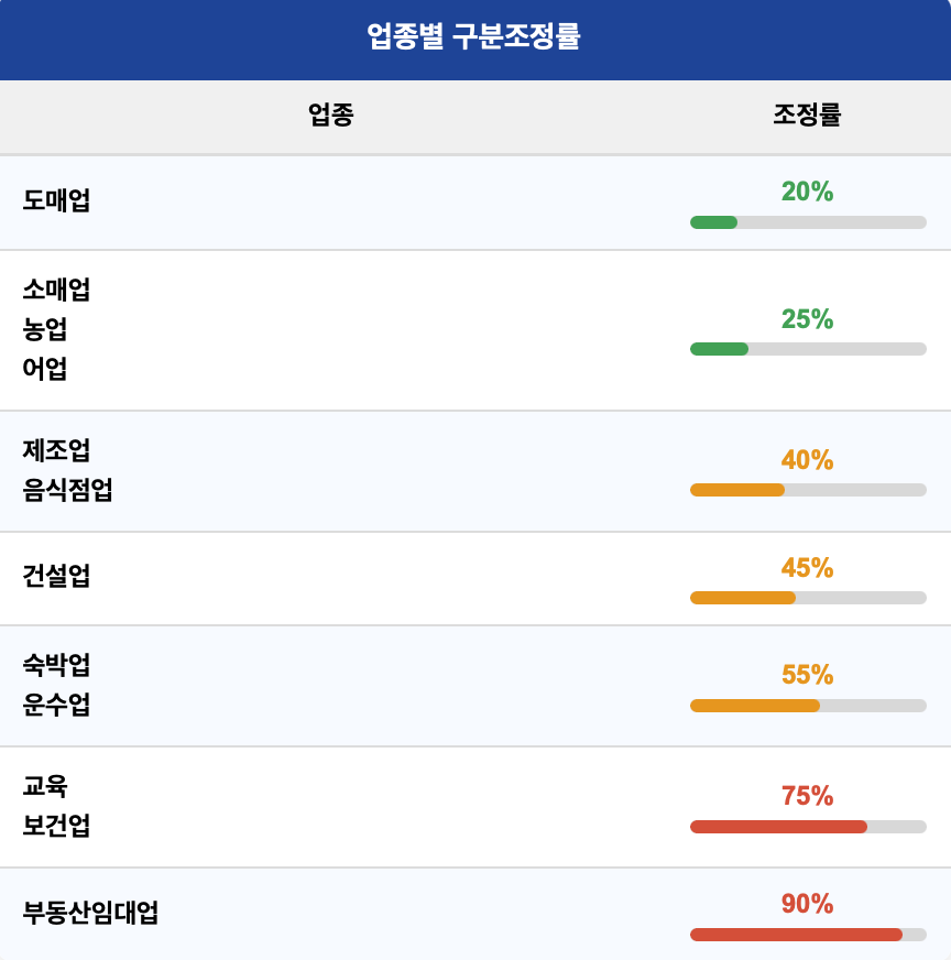 ※ 사업소득은 업종에 따라 일정 비율만을 과세소득으로 인정합니다. 아래 표를 참고해보면 소매업의 경우 25%만 소득으로 계산됩니다.