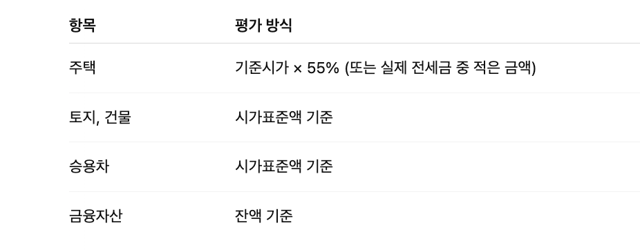 ※ 부채(대출)는 재산 합산액에서 차감할 수 없습니다. 즉, 집값이 3억 원이고 대출이 2억 원 있어도, 재산은 3억 원으로 평가합니다.