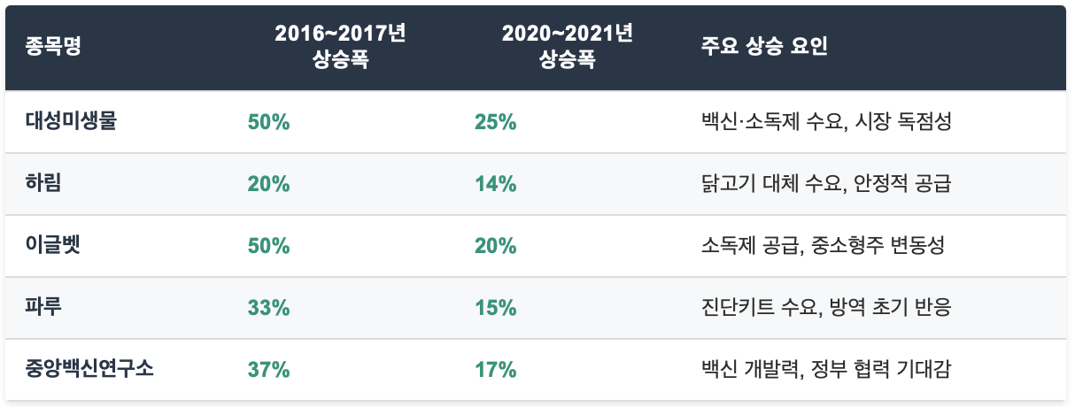 - 2016~2017년 (H5N6): 2016년 11월 5,000원에서 2017년 1월 7,500원으로 약 50% 상승. 소독제와 백신 공급으로 단기 급등, 이후 6,000원대 조정.